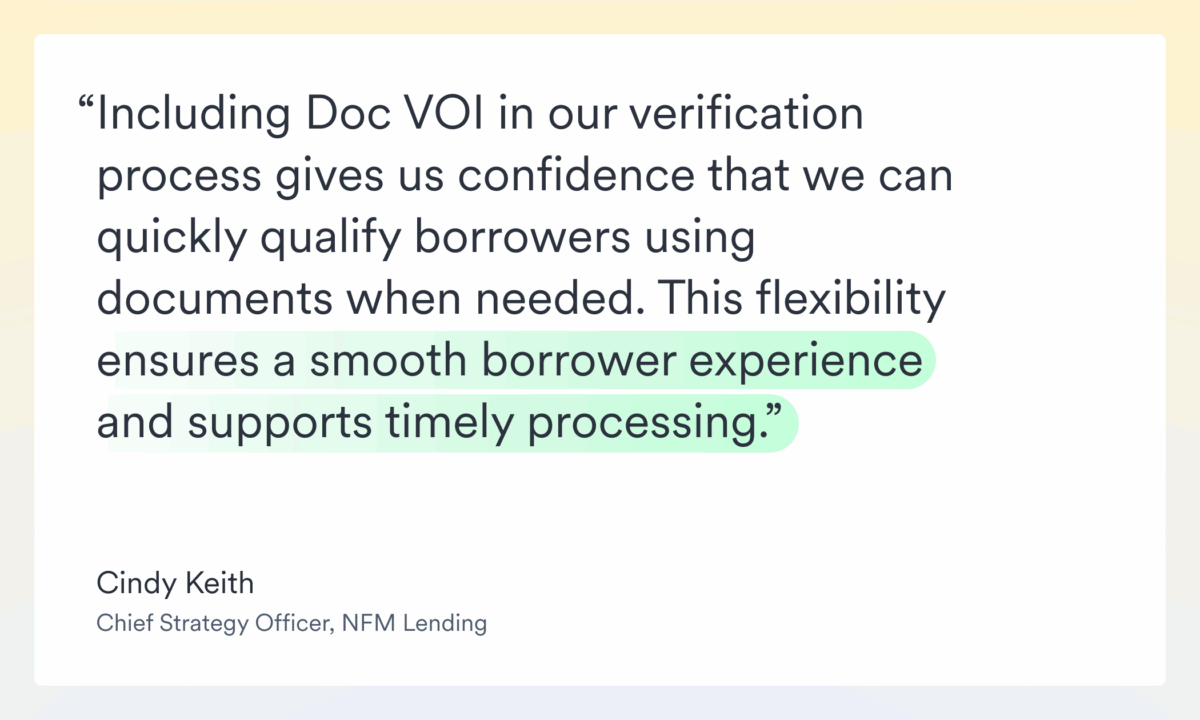 “Working with Argyle has helped us streamline verifications for both our team and our borrowers. Including Doc VOI in our verification process gives us confidence that we can quickly qualify borrowers using documents when needed. This flexibility ensures a smooth borrower experience and supports timely processing.” — Cindy Keith, Chief Strategy Officer, NFM Lending