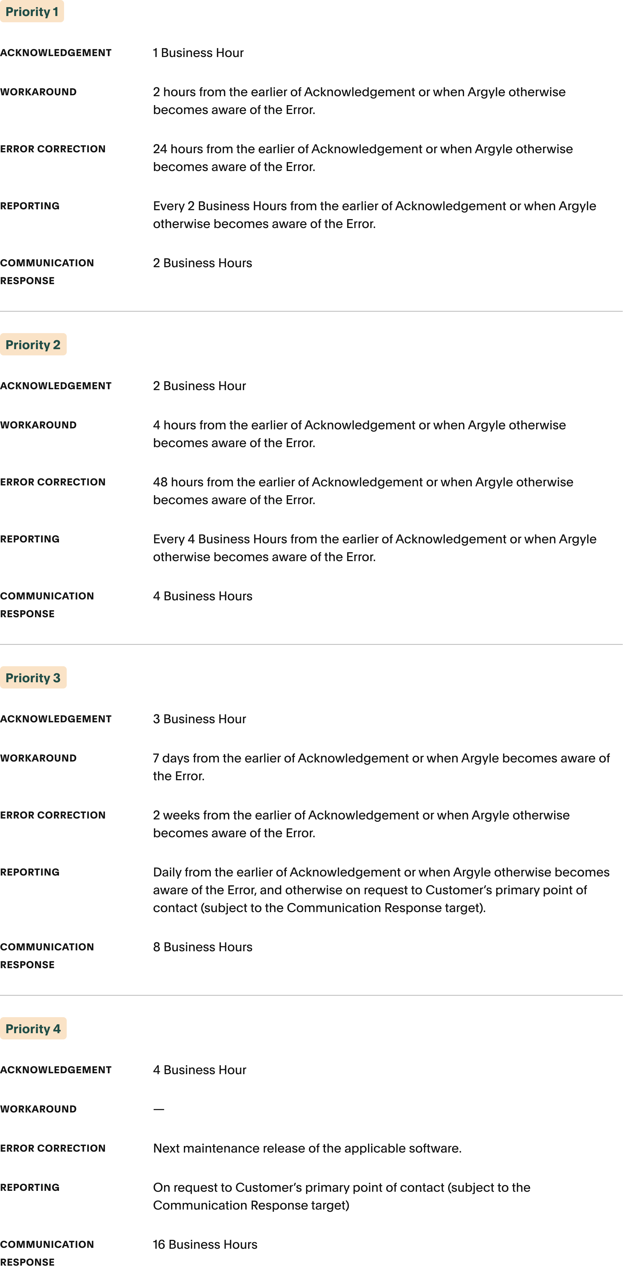 Argyle’s Error acknowledgement, workaround, resolution, and reporting targets, and customer communication response targets are as follows:
